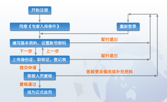 1、為確保注冊(cè)的合法性和唯一性,要求評(píng)標(biāo)專(zhuān)家在注冊(cè)時(shí)提供較完整的個(gè)人資料和職稱(chēng)資質(zhì)文件。由于注冊(cè)所需填寫(xiě)內(nèi)容較多,用戶(hù)可在填完基本資料及登錄帳號(hào)、密碼后暫時(shí)退出,下次重新登錄后繼續(xù)完成后繼步驟。